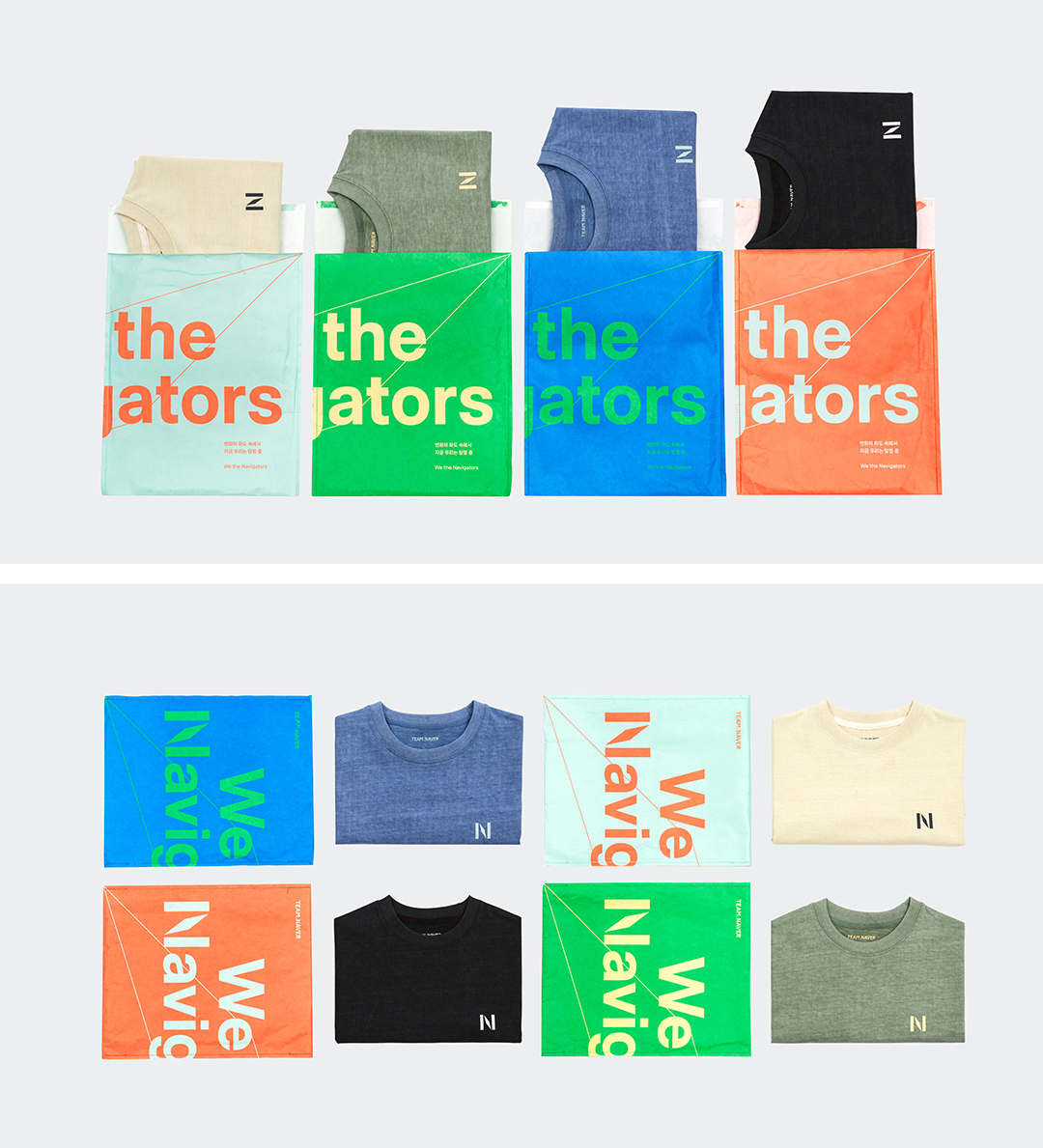 디저브는 본 프로젝트의 패키지에서 제품을 직접 받는 사람들인 팀 네이버가 연상 될 수 있게끔 볼드하고 그래픽적으로 디자인하였습니다. 티셔츠보다 비교적 높은 채도의 패키지 색상은 다양한 사람들이 모여 시너지를 내는 팀 네이버의 열정을 나타내고 역동적인 라인 그래픽을 통해 본 프로젝트의 컨셉인 나침반과 방향성을 드러냅니다.