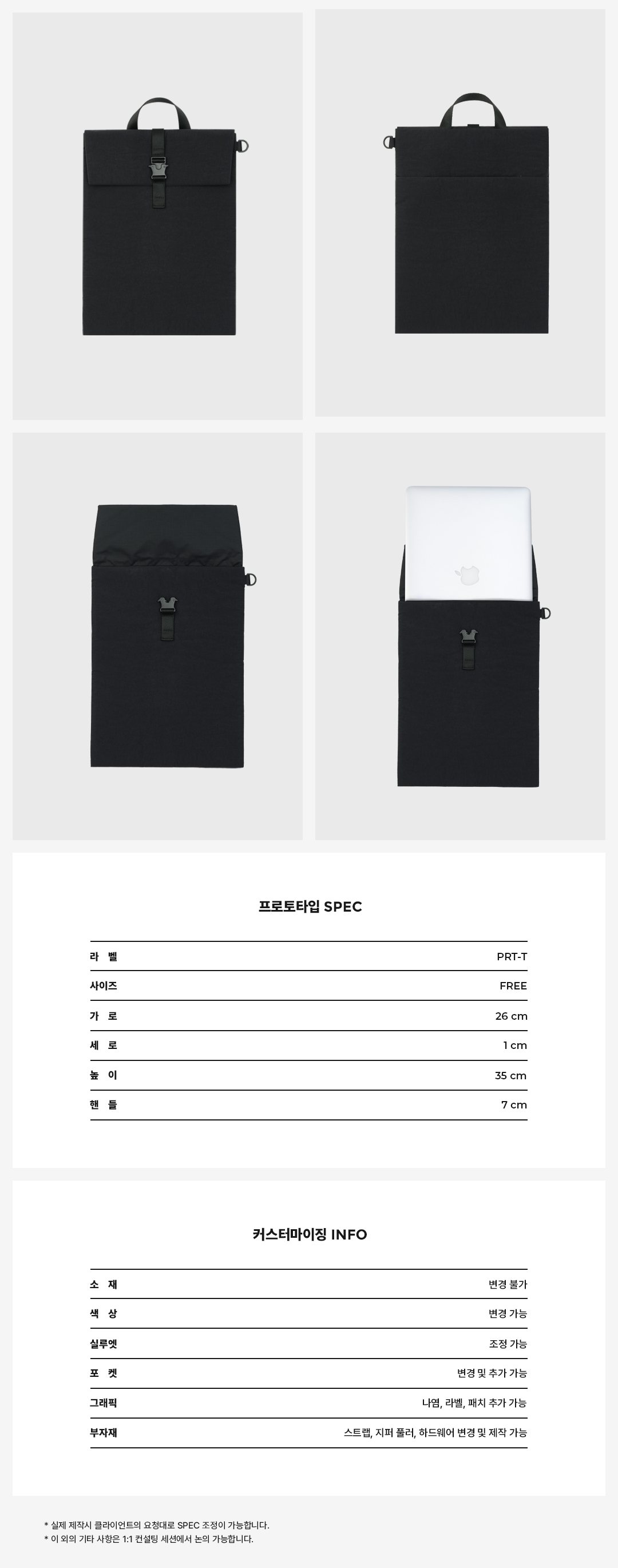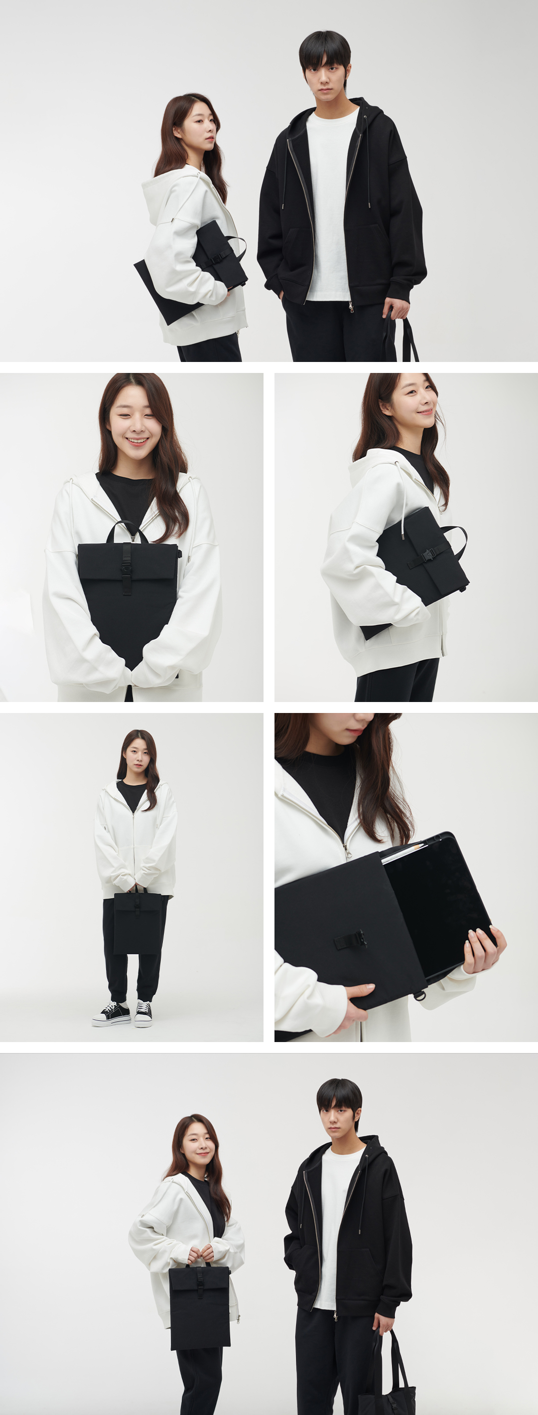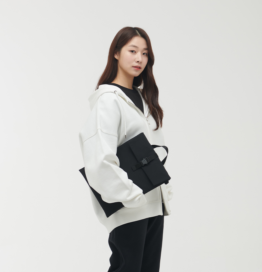 가죽이 아닌 원단으로 가방을 만들시 실루엣이 무너지며 아래로 힘 없이 쳐지기 쉽지만 디저브 에센셜 버클 노트북파우치는 부드러우면서도 견고하게 힘있는 나일론 소재로 제작되어 노트북이나 태블릿 PC를 담아도 실루엣을 유지합니다.
